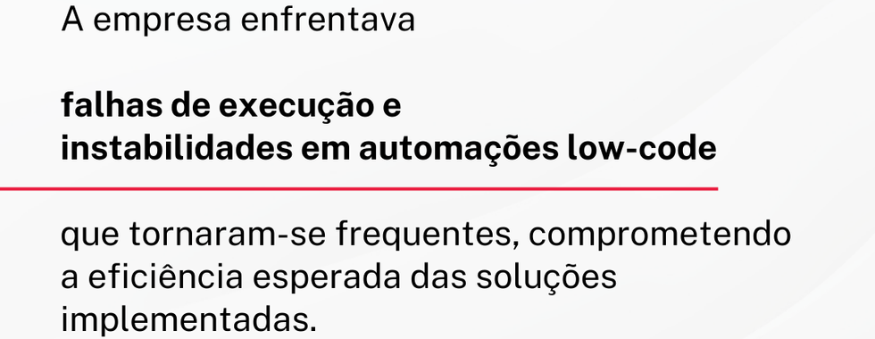 A empresa enfrentava falhas de execução e instabilidades em automações low-code que tornaram-se frequentes, comprometendo a eficiência esperada das soluções implementadas.